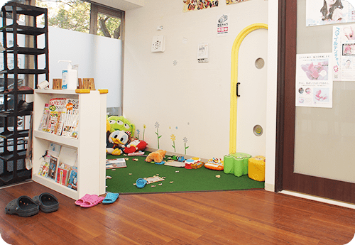 小さお子様が診療までの待ち時間などに、退屈することなく楽しく遊ぶことができます。こちらは、お子様が治療の合間に、お父様お母様が安心して受診できるよう、目の届く範囲でお子様に遊びながらお待ちいただけるスペースです。