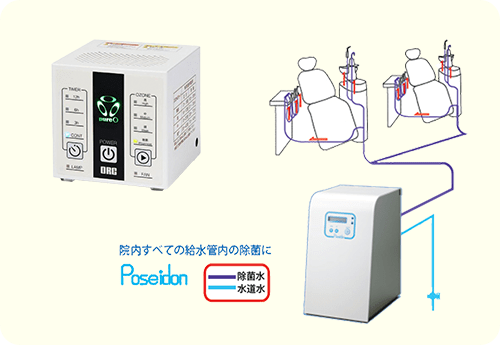 また、歯科治療の際には多くの場面で水を使用していますが、水自体が清潔なものである必要があります。当院では水道水の残留塩素濃度を調節し、1ppmから4〜5ppmまで高めた「電解中性機能水」と呼ばれる殺菌作用の働く特殊な水を用い、ユニット(診療台)内の水自体も細菌からの感染を限りなくゼロに近づけられる装置(ポセイドン)を導入しています。